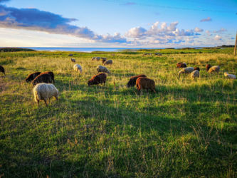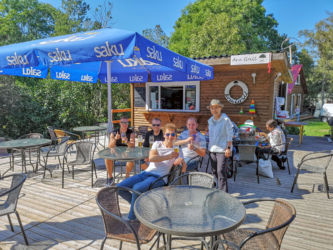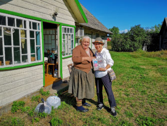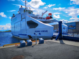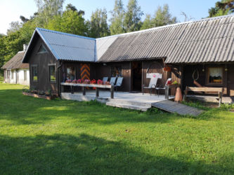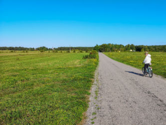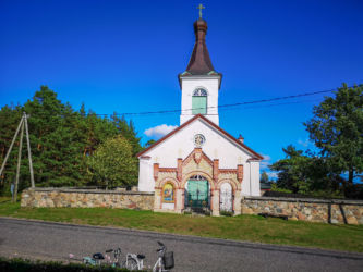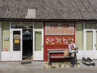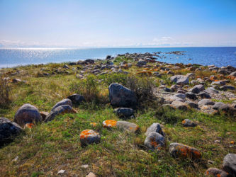 パルヌで専用車に乗り換えキフヌ島行きの港まで30分、フェリーに乗って1時間でキフヌ島につきました。キフヌ島に到着し民宿にチェックインしました。広い敷地の一戸建てでした。夏も終わりで宿泊客は我々の他にはお婆ちゃんのグループが一つ、民宿のスタッフもお婆ちゃんが二人だけす。このお婆ちゃんは大変良い人なのですが英語が喋れないため話が通じず苦労しました。朝起きると羊の群れがやってきて、民宿の前の牧草地で朝食です。草を噛むバリバリという音が響きました。タクシーもバスもないのでレンタル自転車を借りてキフヌ博物館に向かいました。道は平坦で高低差はあまりないのですが、なれない自転車に悪戦苦闘、ようやく博物館に到着しました。博物館の学芸員さんから教えて頂いたキフヌ島手芸の第一人者Roosiさんを訪ねました。ノーアポイントでしたが心良くお会いいただき感謝です。ちょうどじゃがいもを収穫してきた所だそうです。84歳の元気なお婆ちゃんでした。その後、キフヌ島最北端の灯台を目指しました。ようやく静かな岬に到着しましたが、残念ながら灯台は工事中でした。お昼は博物館から500メートルほど離れた集落のオープンレストランでした。陽光の中おいしい昼食とビールを楽しみました。朝晩の食事は民宿のお婆ちゃんが部屋まで届けてくれました。キフヌ島の家庭の味です。素朴ですがどんな高級レストランより美味しい、思い出に残る味でした。